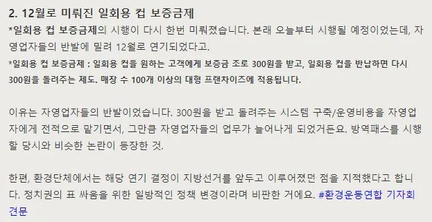 1. Disposable cup deposit system… I hear the system setup/operating costs are entirely borne by self-employed business owners… Hmm, I wonder if we could plan marketing to support this or for related businesses, so I’ll just make a note, note, note…