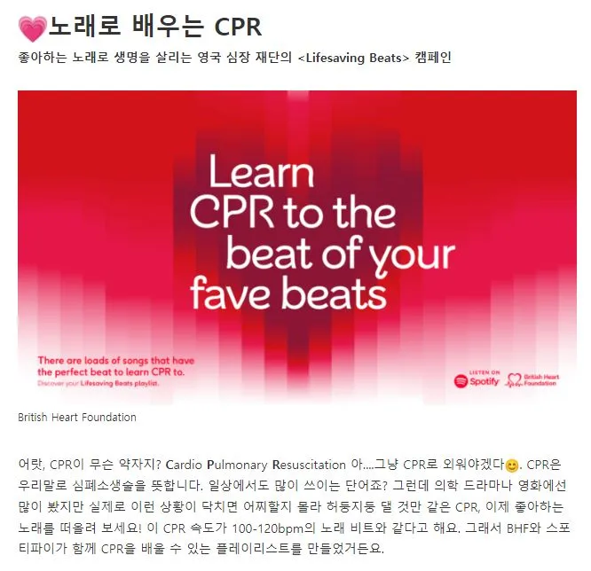 1. Coincidentally, I had saved this as a good example before the Itaewon tragedy… I hope that through campaigns like this, the importance and necessity of CPR will spread far and wide… A playlist matched to CPR speed… I’ve always vaguely wondered how fast it should be, and this is such a great idea!