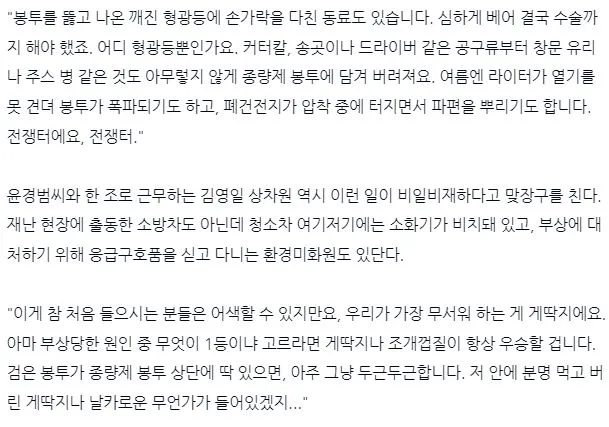 6. I think it was a newspaper column, when I hear the bustling sounds of the street sweepers and sanitation workers diligently working in the early morning, a sudden sense of gratitude washes over me, and I learned that what these individuals fear most are crab shells. From now on, I’ll be really, really careful when disposing of crab shells or sharp objects ㅠㅠ