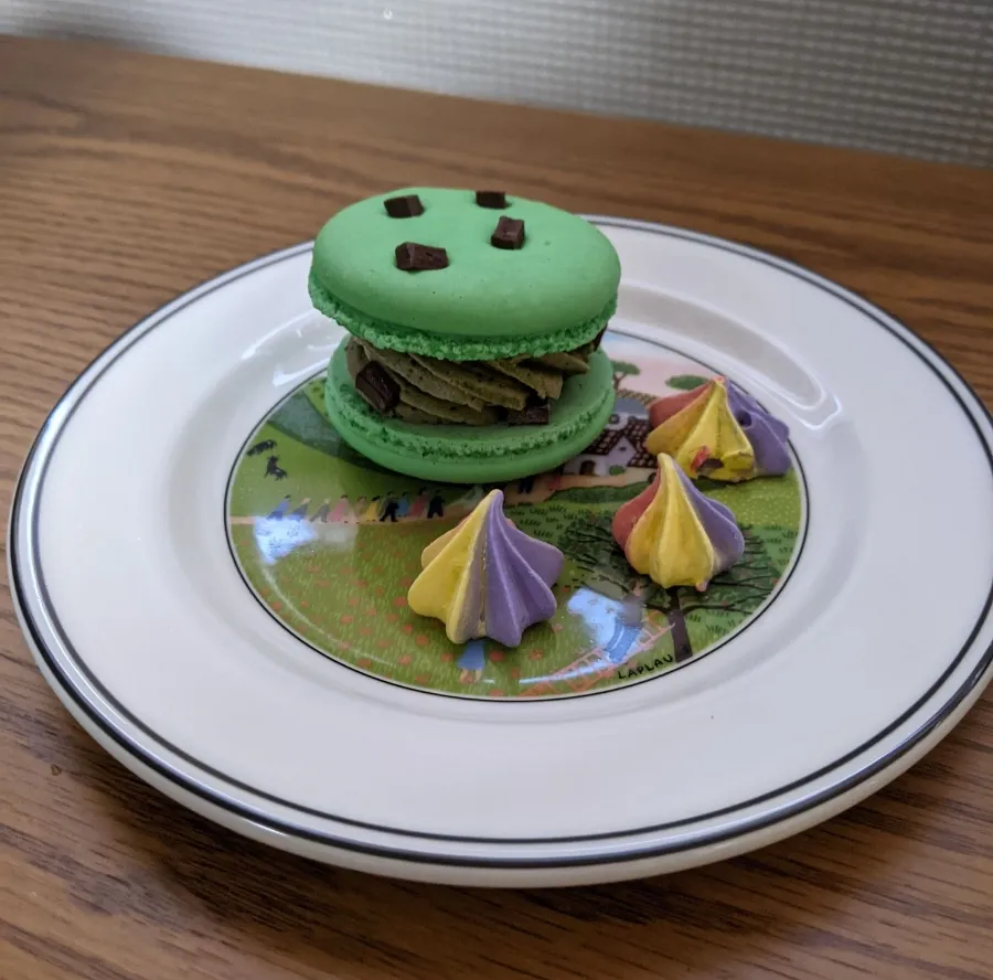 Enduring the afternoon with a matcha chocolate macaron and Earl Grey tea.