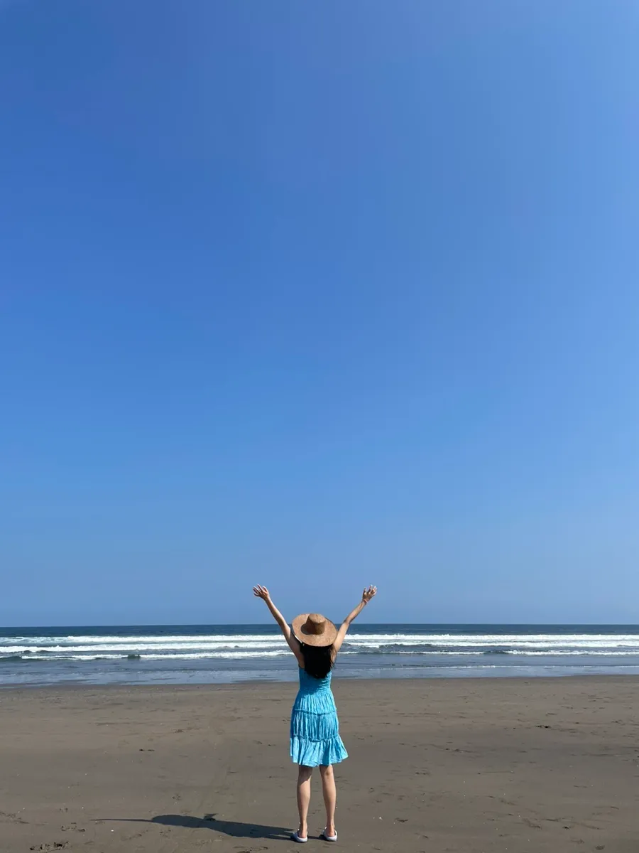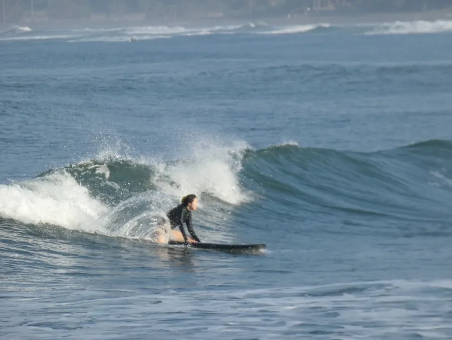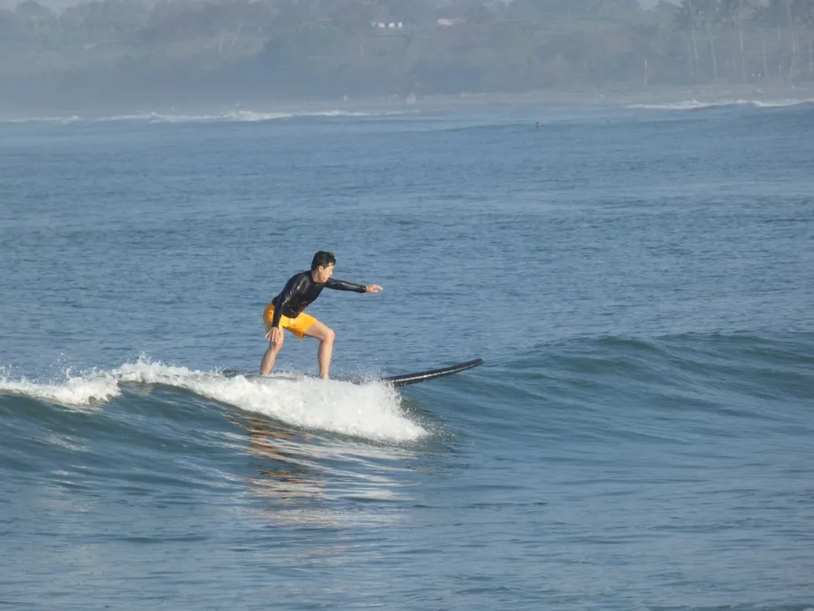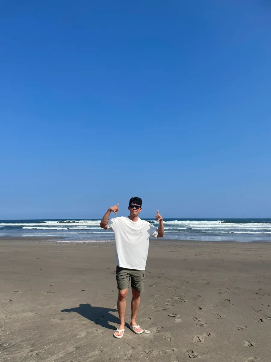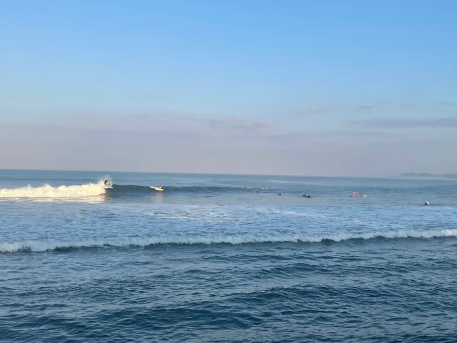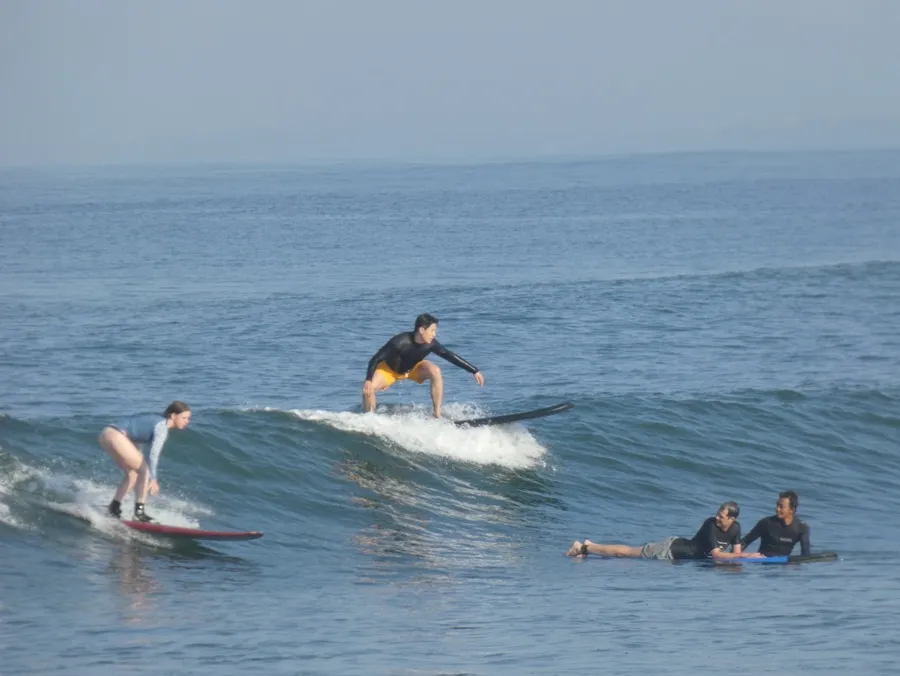 Since we were beginners, we moved to a spot with easier waves. My partner was surfing for the first time, but perhaps because of his basic athletic ability, he quickly stood up on the board.