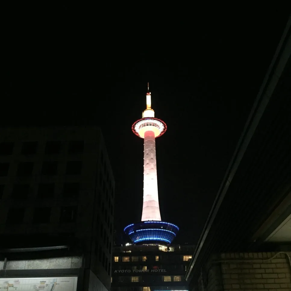 Kyoto Tower, seen after passing the sparkling heart stairs.