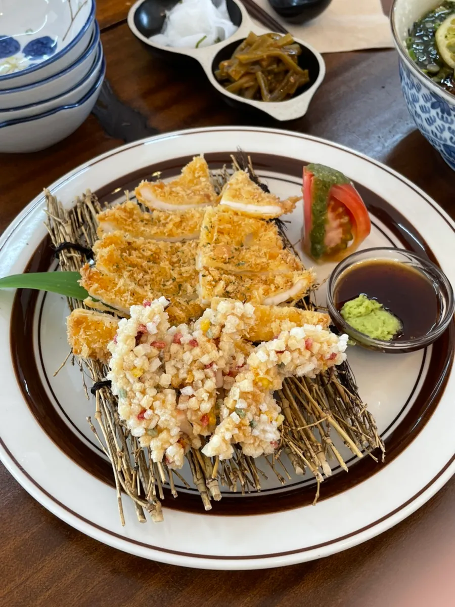 It’s my first time eating fried squid..! The chewy, colorful bits underneath are the leg parts.