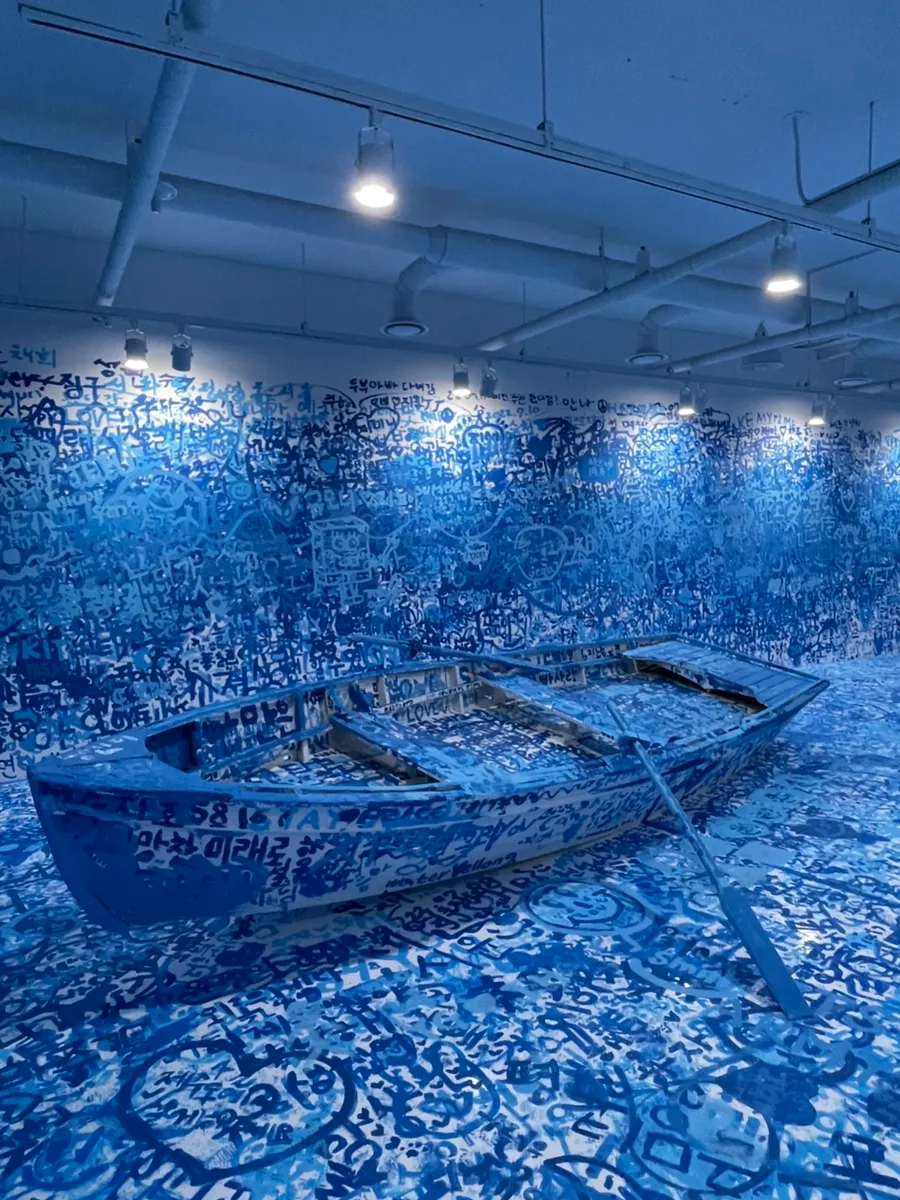 #Addcolour #refugeeboat An interactive artwork, I, too, stepped into the blue world.