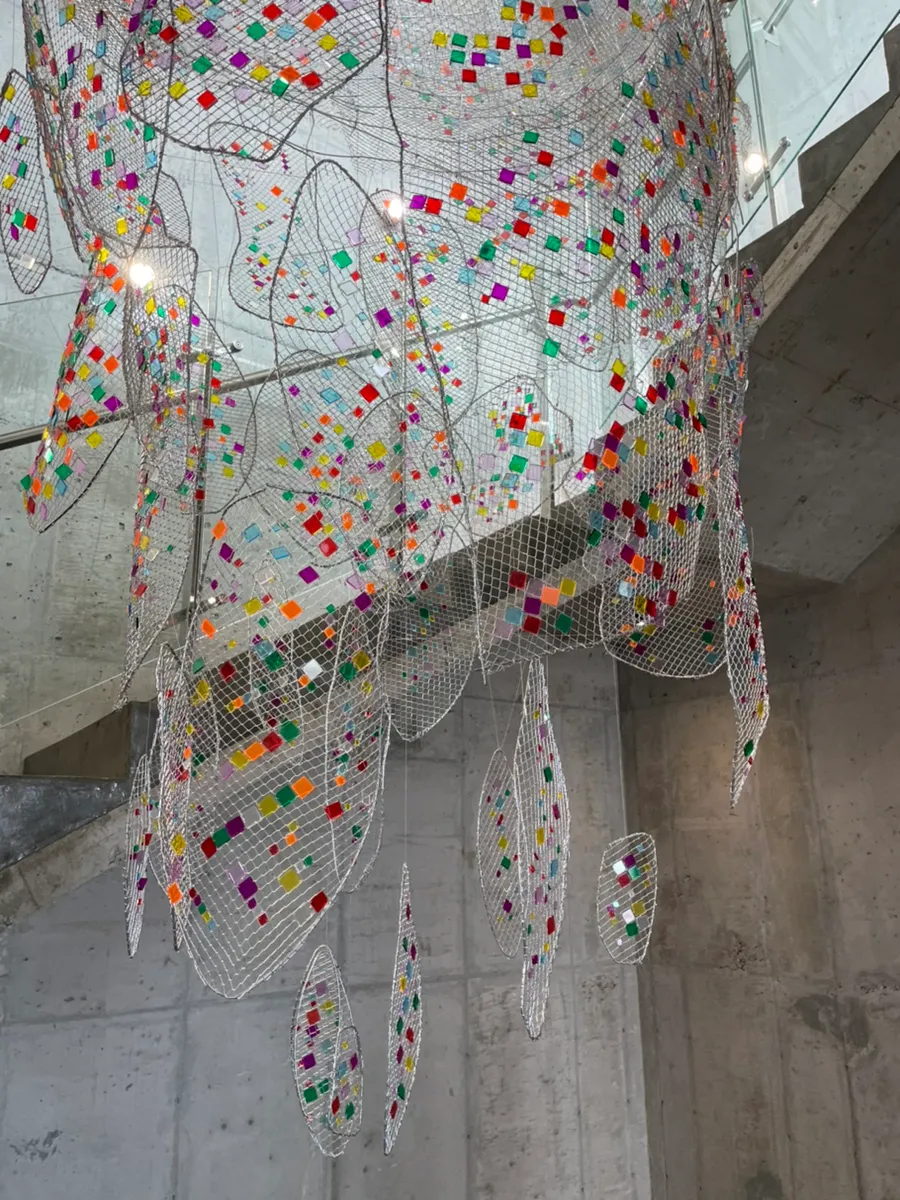 Upon entering, on the way up the stairs, thereās a colorful artwork, which reminded me of dolphins.