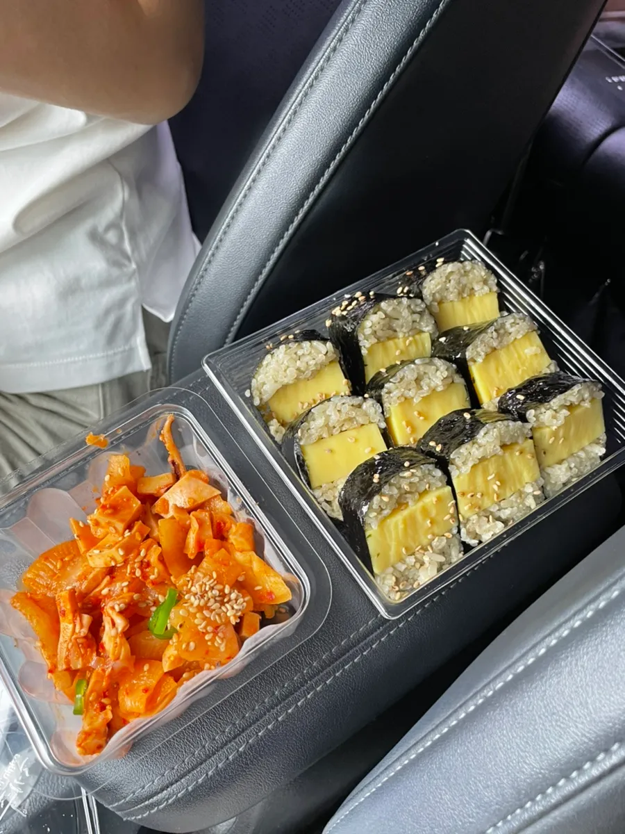 Because of the harsh weather, we intentionally came to the airport early, and for brunch, we had takeout in the car: #JejuKimManBok Gimbap and Spicy Squid Salad