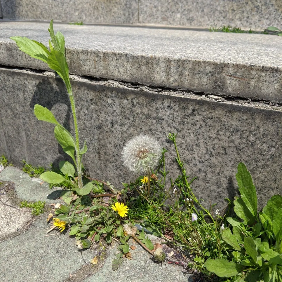 Passing by, I saw dandelions blooming at the bottom of the stairs.