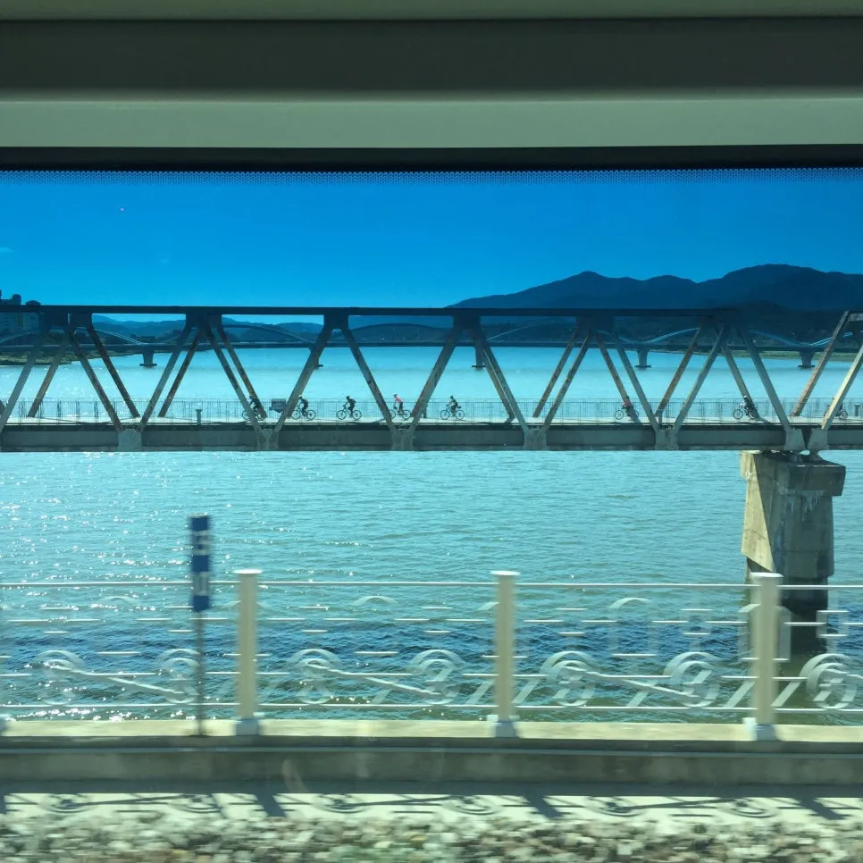 On the way to Yongmun Station, the sparkling river and cyclists outside the car window.